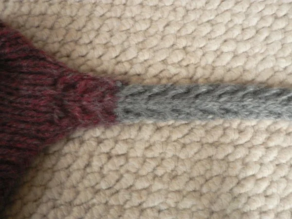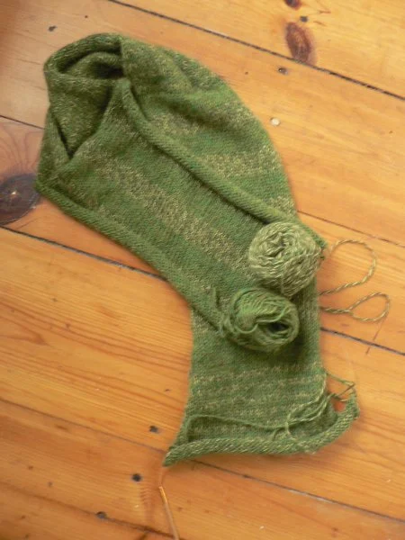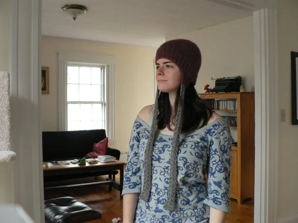 This is the friends earflap hat. The hat part is from a design I had done previously for the fibre company, who's Pemaquid Yarn is featured here. I added the cable flaps and ties in place of the boring old i-cord. It's nice because the weight of the cables makes the earflaps lay flat, so you don't have to tie the ties, which I prefer.
