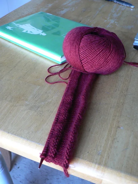 And I am plugging away on the Mother's Sweater still. It has had several different collars. You'll note now it has no collar. It hasn't revealed itself to me yet. Also, I have started and ripped out a sleeve. I have been deciding between a tapered sleeve and a straight sleeve. I'm thinking straight now, after trying the tapered...