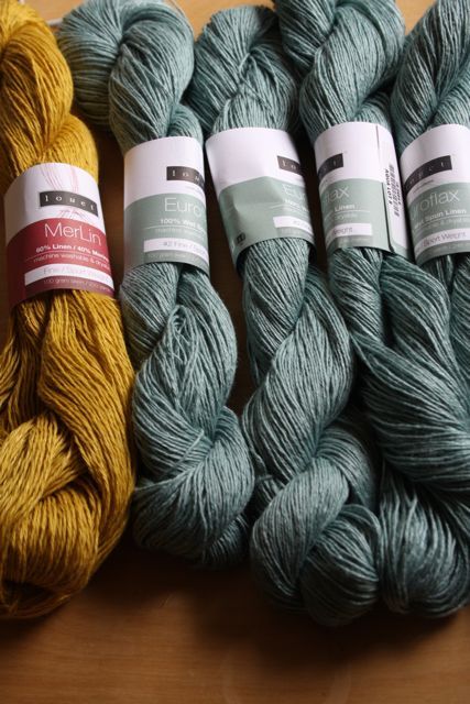 Euroflax in a lovely sea green for an upcoming design and MerLin for a one skein Yoked Cardigan. Looking forward to working with all of it!