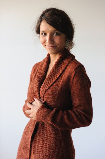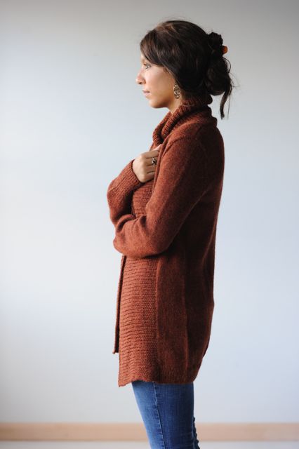This open cardigan is knit from the bottom up in one piece until you reach the underarm edge. The fronts and back are then worked separately. The sleeves are worked separately and then set it. The collar is picked up last, you switch to larger needles half way through so the collar folds out nicely.