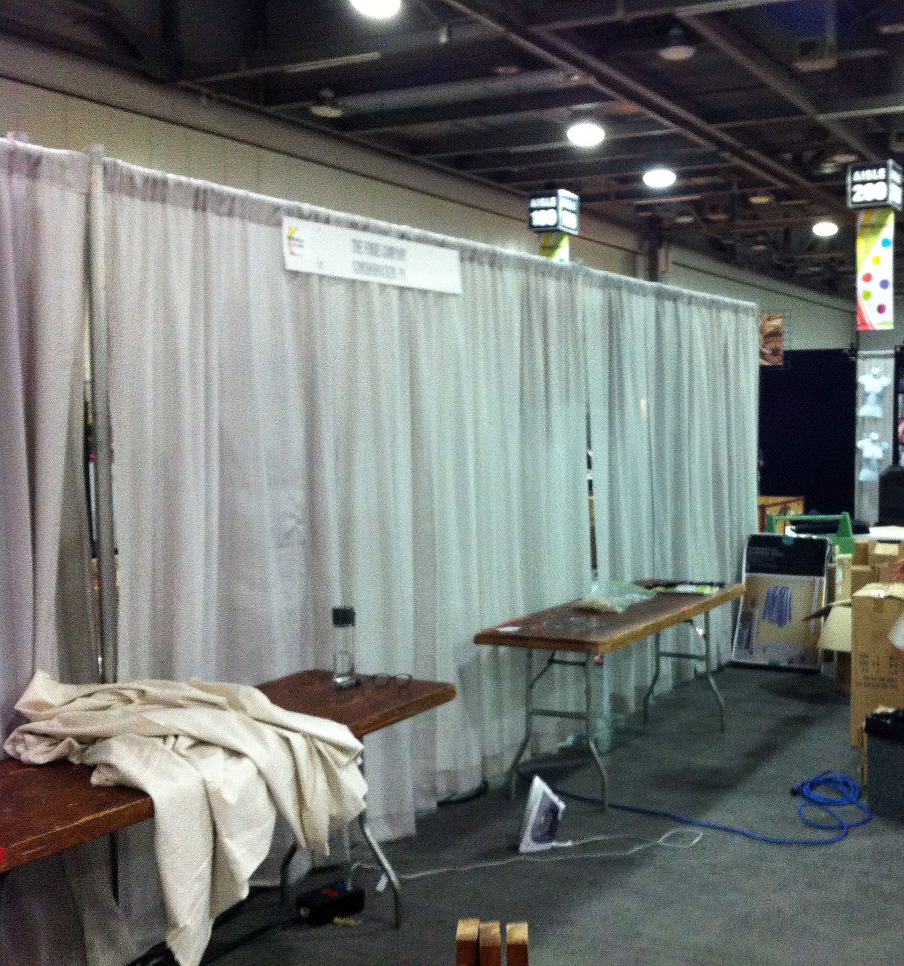Set-up day was Friday, and it took several hours to iron and hang curtains, unfurl and steam skeins of yarn, set up garment displays, etc. All of the booths were being set up at the same time, so it was a hectic flurry of activity in the convention hall. It was all new to me so it was hard not to stare every time a member of the "knitterati" walked by. Norah Gaugahn and I nearly bowled each other over in a doorway and I admit that I may have texted my brother immediately to tell him what happened. By the end of it the booth was looking quite snazzy and we were all tired but ready for the first day of shopping, which began at 9am on Saturday.