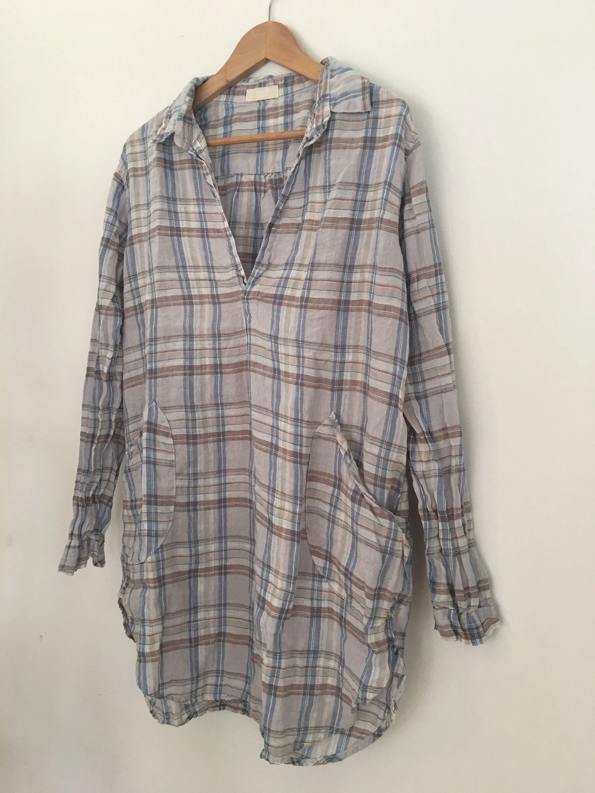 A CP Shades Light Blue Plaid Teton, 100% linen handmade top! We are huge fans of this Northern California company. They pride themselves on this 30 year tradition: They own their own sewing facility and continue to cut, sew and garment-dye in the San Francisco Bay Area.