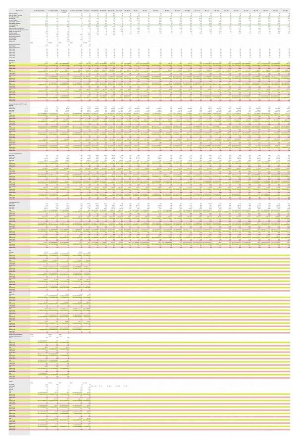 We started with actual body measurements. For sweaters this included 8 different measurements. All sweater averages include 2" of positive ease plus 10%. Hats and mittens are based on head and hand / thumb circumferences plus 10%. Socks are based on foot length and circumference, leg circumference and an average height plus 10%. Neckwear was a little trickier, as it encompasses scarves, cowls and shawls. We took about 100 popular patterns and came up with 3 average dimensions.