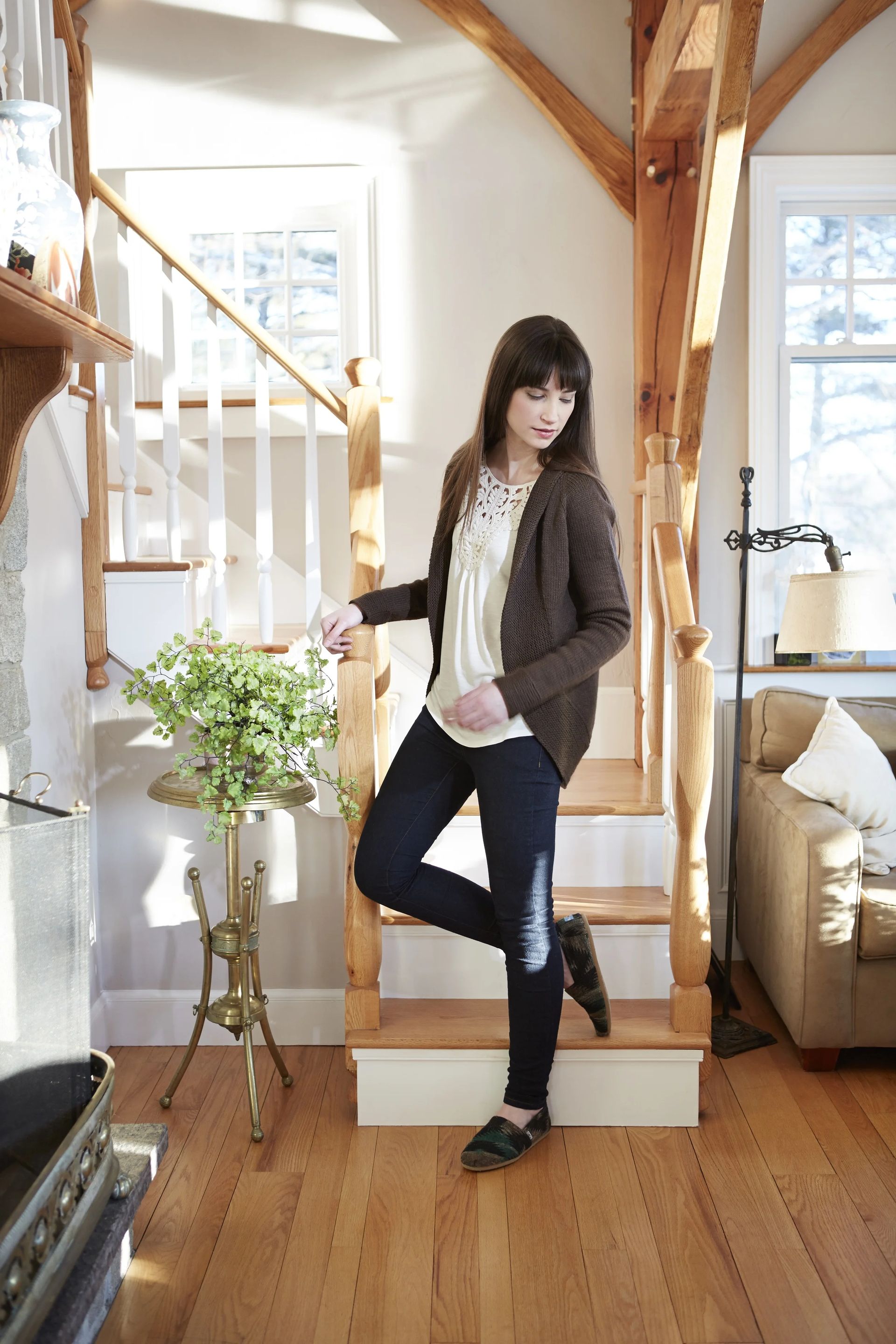 The pictured sweater is knitted seamless from the top down. If you prefer seamed knits, a second set of instructions is included to knit the cardigan in pieces. This will yield the same result. For more on why you might choose one construction method over the other, see page 40 of Home & Away!